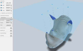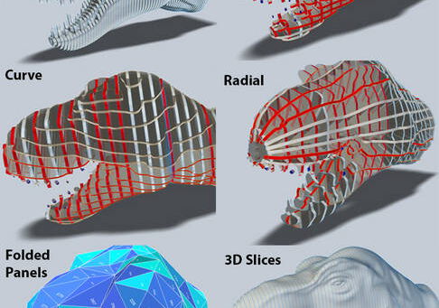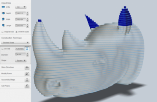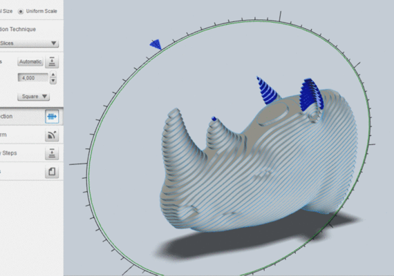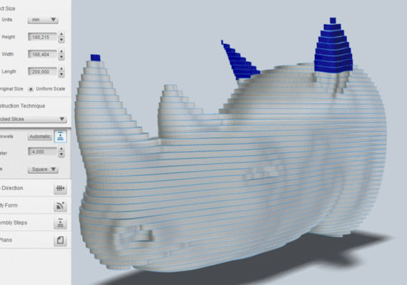 Nun müssen Sie eine der sechs Konstruktions-Techniken auswählen. Wir haben uns in dem Beispiel für „Stacked Slices“ entschieden. Je nach Modell können Sie die Technik anpassen, sodass die visuelle Darstellung optimal ist. So können Sie mit anderen Techniken den Materialaufwand verringern oder das Zusammenstecken vereinfachen. Hier sehen Sie eine Übersicht der verschiedenen Techniken.