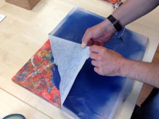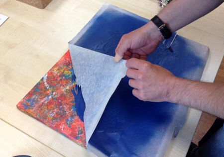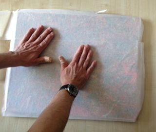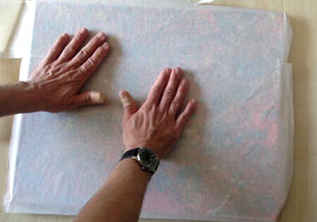 Auf das getrocknete Bild Papiertape, im cameo Onlineshop erhältlich, blasenfrei aufziehen. (Bild Nr.3 + 4)