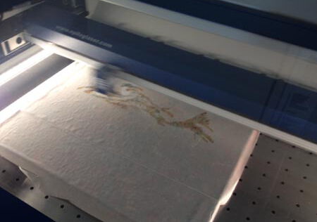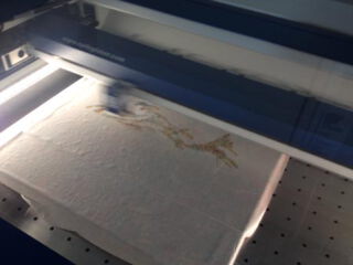 Die Schablonen-Kontur-Datei nun im Rasterverfahren mit einem Epilog Lasersystem lasern, hier wurde ein Epilog Fusion 32 - 60 Watt, verwendet, dabei wurde das „Datei-Schwarze“ auf dem Papiertape verdampft. (Bild Nr.5)