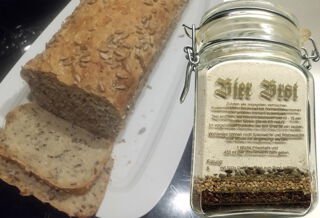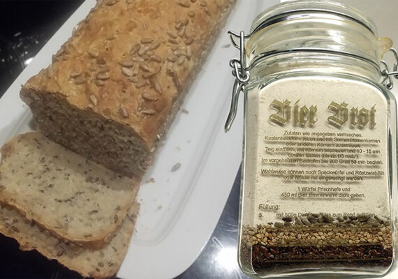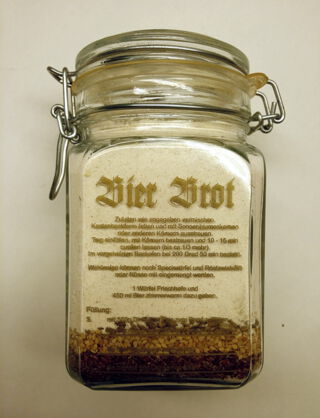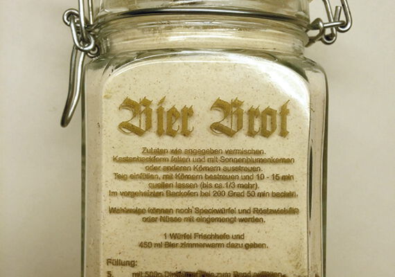 Das Besondere an diesem herzhaften Brot ist, dass in einer mit Gravur vorgegebenen Inhaltsangabe auf dem Einmachglas die Zutaten eingefüllt werden können.