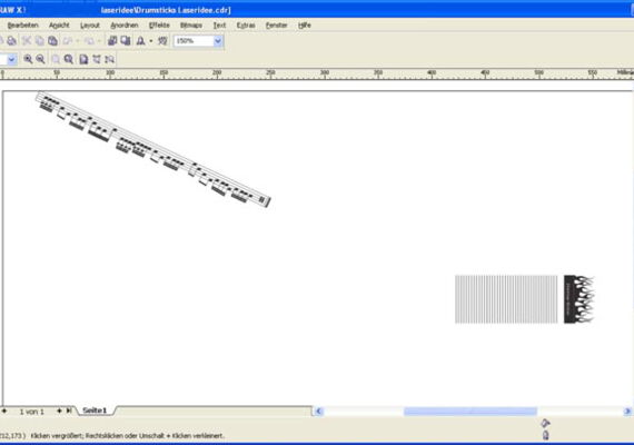 In diesem Beispiel wurde ein Epilog Zing 24 Lasergraviersystem mit 30 Watt mit Rundgravureinrichtung verwendet. Öffnen Sie zunächst die „Drumsticks.cdr“-Datei. Bei der vollflächigen Gravur wurde der Umfang der Sticks rechnerisch ermittelt und entsprechend die Höhe der Vorlage angepasst. Bei den Noten wurde die Vorlage in einem Winkel angelegt und somit die spiralförmige Gravur geschaffen. Fügen Sie bei Bedarf Texte und Designs in die Vorlage ein.