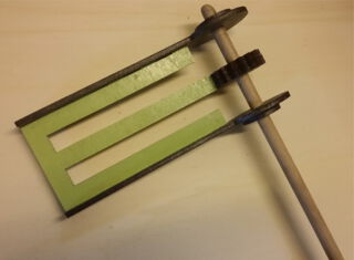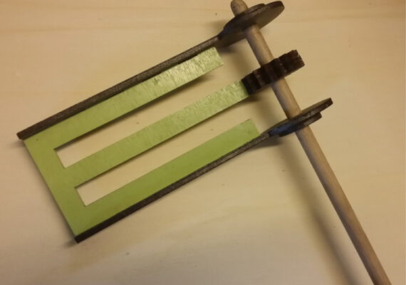Dann die kleine Scheibe auf den Rundstab kleben; Seitenteil aufschieben; die 3 Zahnräder deckungsgleich zusammenkleben und auf den Rundstab schieben; das 2. Seitenteil aufschieben und mit dem Mittelteil wie abgebildet zusammenkleben; die äußere Scheibe und die Zahnräder mittig festkleben.