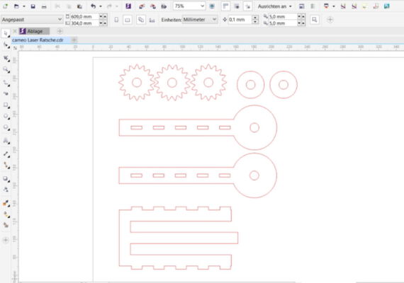 Wir haben ein Epilog Mini 24 mit 40 Watt und folgenden Einstellungen verwendet: Vektor: Geschwindigkeit: 24%, Leistung: 100%, DPI: 600