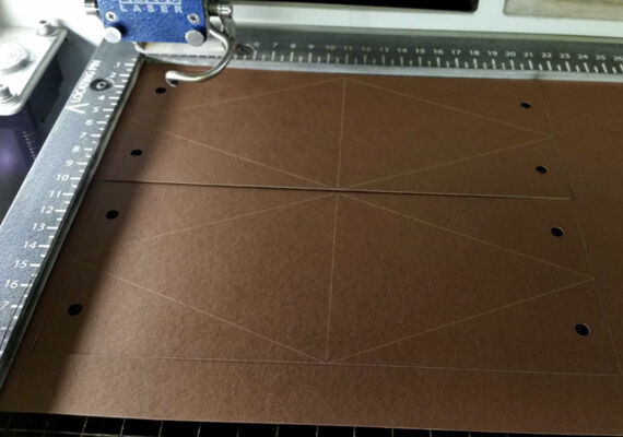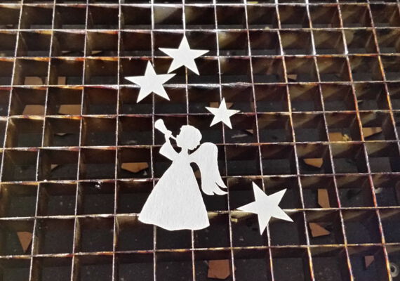 Öffnen Sie die Datei Faltschachtel.cdr und senden diese zum Lasersystem. Legen Sie die braune Pappe in den Laser und schneiden in einem Arbeitsgang zuerst die roten und dann die blauen Linien. Dann platzieren Sie die silberfarbene Pappe in den Laser und schneiden den Engel und die Sterne als Verzierung aus.