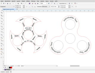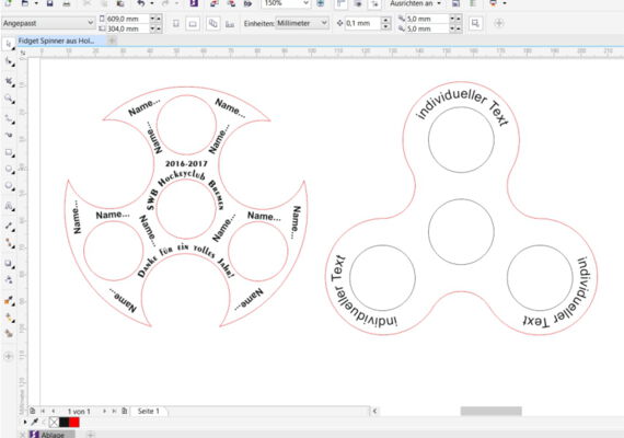 Laden Sie sich die Datei „Fidget Spinner aus Holz.cdr“ herunter. Mit dieser Vorlage können Sie Schriften wie z.B. Namen oder Daten ändern oder Objekte nach Ihren Wünschen einfügen. Legen Sie eine der Holztafeln in das Epilog Lasersystem und geben Sie den Druckbefehl mit den unten genannten Parametern an. Das Gleiche wiederholen Sie mit der andersfarbigen Tafel.
