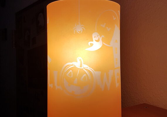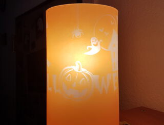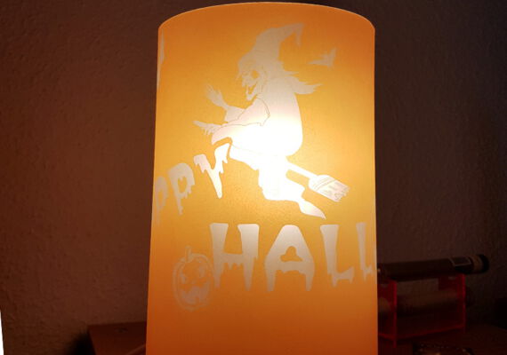 Passend zu Halloween finden Sie hier Schritt für Schritt eine Anleitung zur Herstellung einer individuellen Glasgravur auf einer bunten Lampe.
