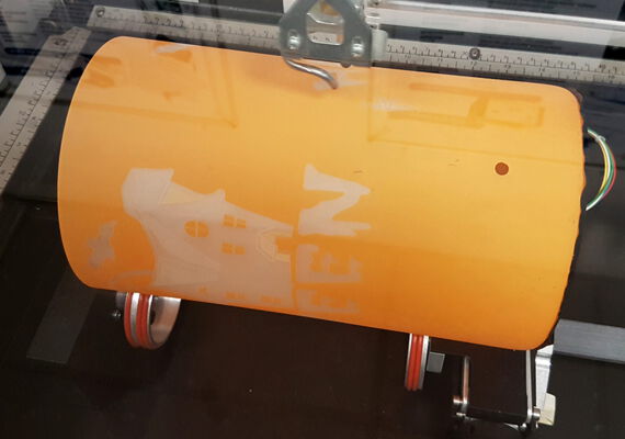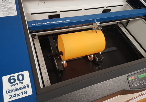 Sie können unsere Gravierdatei verwenden oder selbst eine Dateivorlage nach Ihren Wünschen gestalten. Legen Sie die Rundgravureinheit in den Laser und spannen Sie die Lampe ein. Schalten Sie das Lasersystem erst jetzt ein.