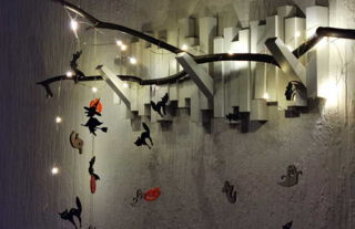 Sie können unsere Gravierdatei verwenden oder selbst eine Dateivorlage nach Ihren Wünschen gestalten. Legen Sie die Acrylglasplatte auf das Wabenschneidegitter und schneiden Sie die Motive aus. Mit einem Nähfaden haben wir die Motive individuell eingefädelt und an den inzwischen „schwarz angemalten Ast“ geknotet. Auch den Lichterdraht haben wir um den Ast gewickelt.