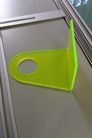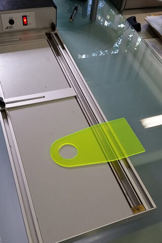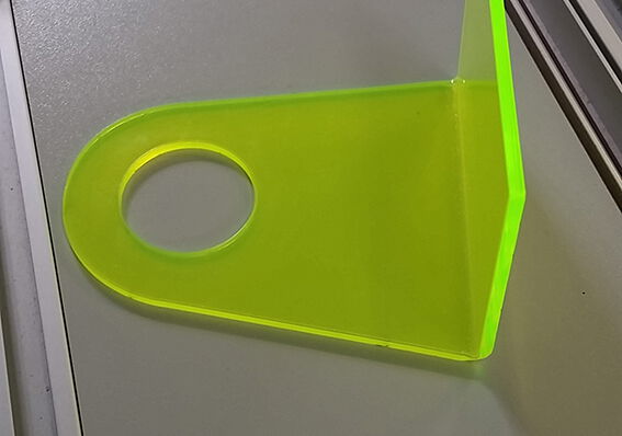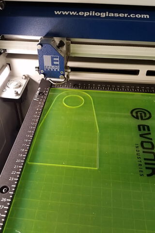 Mit einem Kunststoff-Biegegerät die ausgelaserte Form an der zu biegenden Stelle heiß machen und umbiegen. Sie können die Platte alternativ auch in einem vorgeheizten Umluft-Backofen bei ca. 170°C für ca. 3 Minuten erhitzen und vorsichtig über z. B. eine Tischkante umbiegen.