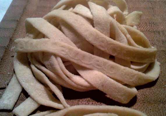 Wir haben ein Nudelholz mit einer Walzenbreite von 25 cm und einem Umfang von 20 cm verwendet. Passen Sie ggf. die Seitengröße an Ihre Nudelholzmaße an. Achten Sie auch auf die Breite Ihrer Bandnudeln und nehmen Sie ggf. Anpassungen vor. Unsere Bandnudelvorlage haben wir auf eine Breite von 0,6 cm ausgerichtet.