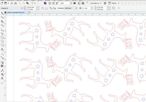 Laden Sie die Dateivorlage cameo Laseridee Elch Spiegelplexi und nehmen Sie ggf. Anpassungen vor. Wir haben den Epilog Schneidetisch mit konusförmigen Reflexionsprotektoren (nur für zing 16, zing 24, Fusion 32 und 40 M2) besteckt und das Acrylglas / Plexiglas hochgelagert.