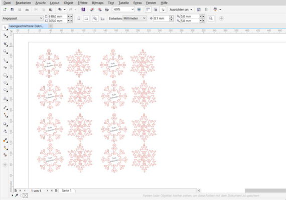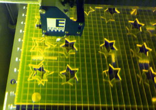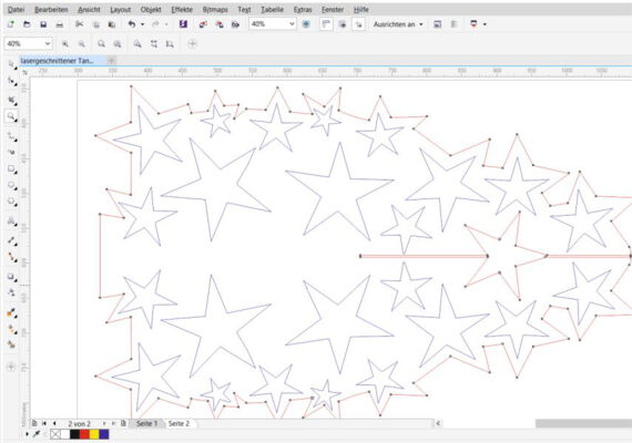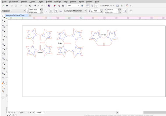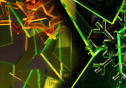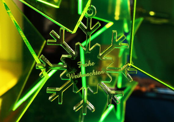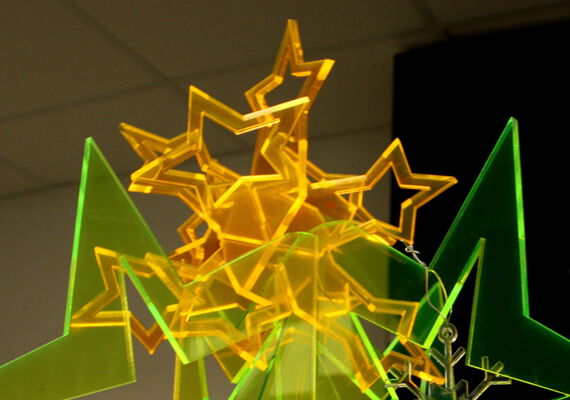 Laden Sie die Dateivorlagen lasergeschnittener Tannenbaum.cdr, lasergeschnittene Tannenbaum-Sternspitze.cdr und lasergeschnittene Eiskristalle.cdr und nehmen Sie ggf. Anpassungen vor. Wir haben den Epilog Schneidetisch mit konusförmigen Reflexionsprotektoren (nur für Zing 16, Zing 24, Fusion 32 und 40 M2) besteckt und das Acrylglas / Plexiglas hochgelagert. Schneiden Sie die Acrylglasartikel mit dem Epilog Laser Cutter aus und stecken Sie die Teile zusammen. Die lasergeschnittenen Eiskristalle können Sie noch zusätzlich individuell gravieren und an dem Baum hängen.