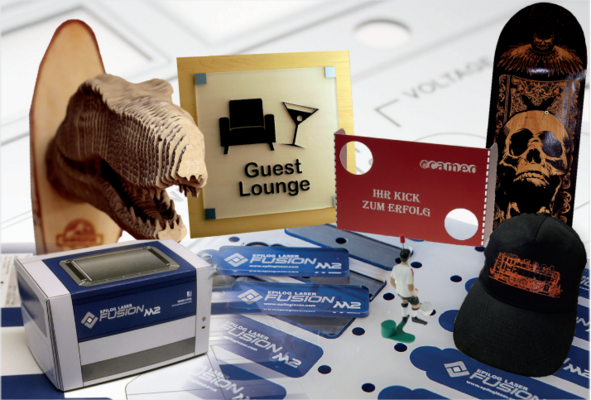 Wie den Fusion dual können Messebesucher auch die neuesten Modelle aus der cameo Laser-Auswahl direkt vor Ort testen: den LASERMAXX PLOTT 100 und den LASERMAXX GALVO easy. „Der LASERMAXX PLOTT, ein CO2-System, ist ein exzellentes Laserschneidsystem mit einem Preis-Leistungsverhältnis, das am Markt seinesgleichen sucht“, betont der cameo Laser-Mitarbeiter. Mit dem Gerät können Holz und Kunststoffe, aber auch Papier, Karton und Plexiglas hoch präzise bearbeitet werden. Starke Werkstoffe wie zum Beispiel 15 mm dickes Acryl schneidet der LASERMAXX PLOTT mit nur 100 Watt und erzeugt dabei auffallend gerade, sehr saubere Kanten. Als Werkzeug für die industrielle Fertigung zeichnet sich der LASERMAXX GALVO easy aus. Mit ihm lassen sich alle Metalle, technische Kunststoffe und viele weitere Materialien schnell und sehr detailreich beschriften. „Das System ist mit einer gepulsten Q-switched Laserquelle ausgestattet, die besonders leistungsfähig ist. Mit kurzen Pulsen werden in einem sich wiederholenden Vorgang Energiespitzen erreicht, die eine materialabhebende Gravur erzeugen. So können Produkte, Maschinen, Schilder, Etiketten oder Werkzeugteile dauerhaft und beständig mit Kennzahlen, Schriftzügen, Symbolen, Fotos, Datamatrix- oder Barcodes in unterschiedlichen Färbungen und Tiefen markiert werden“, erläutert Michael Ebel. Auch einen Klassiker hat er auf der viscom dabei: den Epilog zing 24. „Mit ihm zeigen wir, wie sich ein edler Brandingeffekt auf Textilien erzeugen lässt und Strassapplikation im Handumdrehen veredelt werden“, fügt er hinzu.