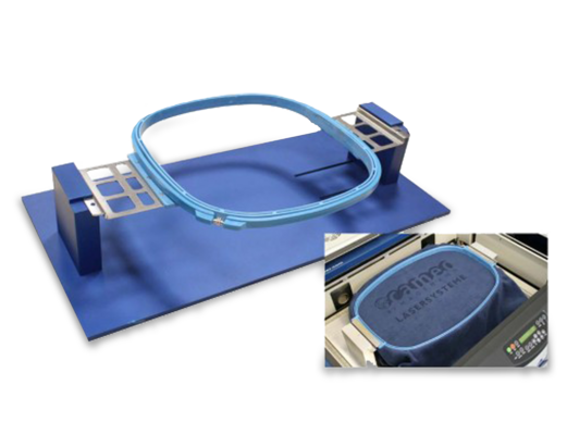Die eigens entwickelte Halterung ist größenverstellbar. Im Stickrahmen lassen sich Textilien optimal fixieren. Sticken und Lasern lassen sich damit ohne Umrüsten kombinieren.